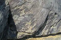 Tomskaya pisanitsa is situated on the right bank of the river Tom. Here the nature has created a unique place — smooth vertical stones and a small platform before them, a kind of scene. Ancient people could not but use this gift of nature. They have transformed this place into a sanctuary where they came to pray to the Gods, to ask them for successful hunting. The lead character of Tom's Rock Art is beautiful elk. Elks were not only objects of prey, they turned into objects of worship, into concentration of vital forces and power. About hundred figures of these animals are knocked out on the Tomskaya pisanitsa. Also we can see drawings of others representatives of fauna: bears, the fox, the wolf, birds. Many anthropomorphous images are on the Tomskaya Pisanitsa. These are schematic drawings of people, often wearing animal masks. Among the images solar signs are knocked out. The majority of the images of the Tomskaya pisanitsa date from the aeneolithic period and Bronze Age, 3rd and 2nd millennia BC. Drawings of boats and fantastic animals attract special interest. Many peoples of the world associate a boat with the idea of their relative's voyage down "the river of the dead", i.e. to the next world.