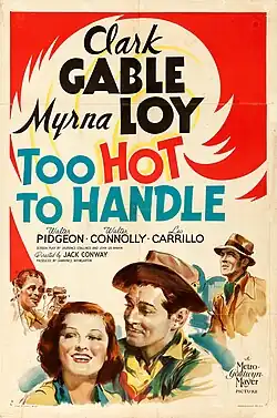 Too Hot to Handle, also known as Let 'Em All Talk, is a 1938 comedy-drama directed by Jack Conway and starring Clark Gable, Myrna Loy, and Walter Pidgeon. The plot concerns a newsreel reporter, the female aviator he is attracted to (influenced by Amelia Earhart, who had disappeared 14 months earlier)[2] and his fierce competitor. Many of the comedy gags were devised by an uncredited Buster Keaton.