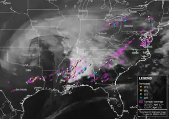 Map of tornado warnings and confirmed tornadoes from the outbreak with infrared satellite imagery of the storm system from the morning of April 14