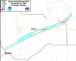1. ^ a b c d Mike Branick (2006). "A Look Back on the Tornado Outbreak in Oklahoma on 22 May 1981—The Binger Tornado" (PDF). NOAA. Retrieved October 27, 2006.