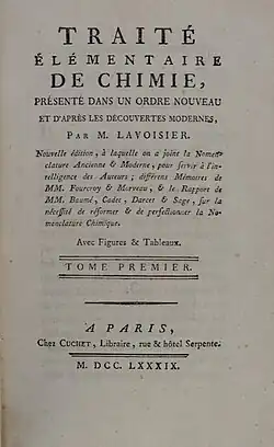 Traité élémentaire de chimie[1] is a textbook written by Antoine Lavoisier published in 1789 and translated into English by Robert Kerr in 1790 under the title Elements of Chemistry in a New Systematic Order containing All the Modern Discoveries.[2] It is considered to be the first modern chemical textbook.[3]