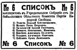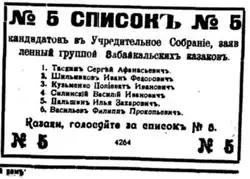The Transbaikal electoral district (Russian: Забайкальский избирательный округ) was a constituency created for the 1917 Russian Constituent Assembly election. The electoral district covered the Transbaikal Oblast.[3] 6 out of the 15 submitted lists in Transbaikal were rejected by the electoral authorities.[4]