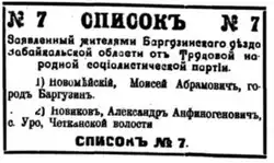 Rupen (1964) lists largely similar results as Radkey, but with different totals for the Union of Transbaikal Old Believers (176 votes) and instead of the Popular Socialists he mentions a "Barguzin Branch, RSDRP" with 1,248 votes. He refers to the Mensheviks as "Chita Branch, RSDRP [Mensheviks]".[11]