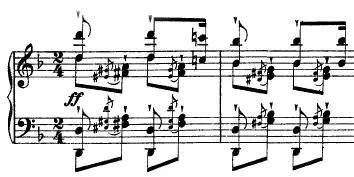 Mazeppa is ranked among the most difficult of the twelve études both musically and technically, alongside Feux Follets (the fifth in the set).[2] According to G. Henle Verlag, a German publisher of sheet music, it is rated at the highest difficulty along with five other compositions within this set of Transcendental Études.[3] Successful execution requires great speed and endurance, as well as a complete familiarity with the piano due to the abundance of jumps that span more than an octave.