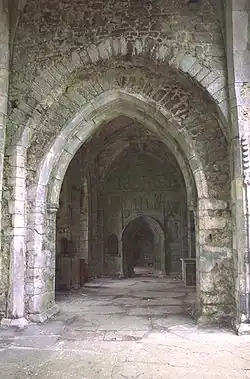 A transept (with two semitransepts) is a transverse part of any building, which lies across the main body of the building.[1] In cruciform ("cross-shaped") churches, in particular within the Romanesque and Gothic Christian church architectural traditions, a transept is an area set crosswise to the nave. Each half of a transept is known as a semitransept.[1]