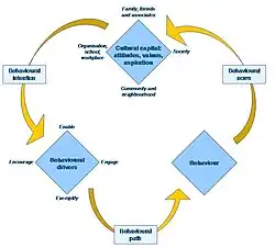 These cultural capital influences include the role of parenting, families and close associates; organizations such as schools and workplaces; communities and neighborhoods; and wider social influences such as the media. It is argued that this cultural capital manifests into specific values, attitudes or social norms which in turn guide the behavioral intentions that individuals adopt in regard to particular decisions or courses of action. These behavioral intentions interact with other factors driving behavior such as financial incentives, regulation and legislation, or levels of information, to drive actual behavior and ultimately feed back into underlying cultural capital.