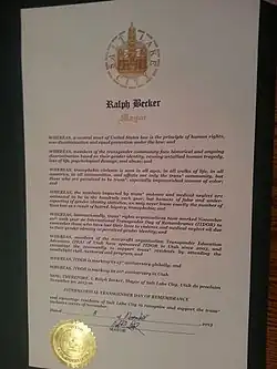 Supported by TEA and other LGBT groups in Utah, Salt Lake City mayor Ralph Becker declared November 20, 2013, "International Transgender Day in Utah", the first public acknowledgement of the annual event by a Utah governmental office.[11]