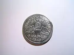 The reverse of the two franc coin of 1943, on which the motto appears.