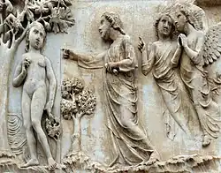 A marble bas relief by Lorenzo Maitani on the Orvieto Cathedral, Italy, depicts Eve and the tree.