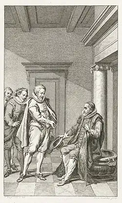 In the trial of Oldenbarnevelt c.s. the court apparently ordered an intendit. This term has puzzled many historians. It was not an "indictment" (as Van den Bergh thinks), nor something comparable to the Conclusion or Opinion given by an Advocate general before the Court of Justice of the European Union (as Uitterhoeve states[19]), nor is it a requisitoir (summing up by the prosecutor) as in modern Dutch criminal cases. The legal concept intendit was found in two contexts in Dutch civil procedural law, firstly in default cases, where the plaintiff was allowed to enter an intendit after the fourth failure of the defendant to appear in court; secondly after the interlocutory order of the court to grant an appointement bij intendit. In both cases it meant a document that contains an exposition of the case of the plaintiff with his supporting evidence. In the second case the order was granted if the defendant denied the facts as presented by the plaintiff, without offering any evidence to support his denial. Alternatives were appointement in feite contrarie (in which case the defendant offered contrary evidence and parties had to prove who was right) and appointement bij memoriën (if the dispute was not about facts, but about points of law).[20] In criminal cases, however, an intendit seems to have been ordered from the prosecutor, again as an exposition of his case, but to act as a guide for further interrogation of witnesses.[21]