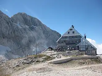 The Triglav Lodge at Kredarica (Slovene: Triglavski dom na Kredarici) (2,515 m) is the highest mountain hut in Slovenia and the highest meteorological station in the country. It stands on a small plateau just under the peak of Kredarica, an elevation in the ridge between Rjavina and Triglav. The Valentin Stanič Lodge (Dom Valentina Staniča) stands to the northeast below Begunje Peak (Begunjski vrh, 2,460 m), and the Planika Lodge at Triglav (Dom Planika pod Triglavom) stands to the south. In the vicinity there is also a chapel dedicated to Our Lady of the Snows, and a few metres away there is a small cave named Ivačič Cave.