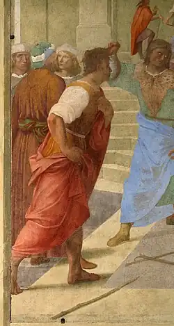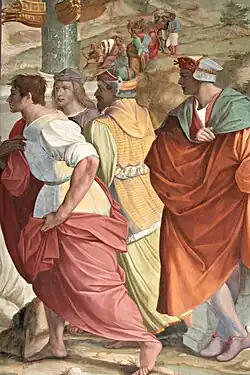 Allori expanded Franciabigio's fresco, Triumph of Cicero, by adding new figures that he copied from Franciabigio's earlier works in the Chiostro dello Scalzo and Santissima Annunziata in Florence.[5] His additions, the band with the obelisk and the rostral column, as well as the statue of the river god Tiber and the group of four figures in the right foreground give the fresco greater breadth in keeping with the renewed spatial design. In this way, Allori completed the work begun decades earlier, honoring the classical themes of the Medici and strengthening their legacy in Florence.