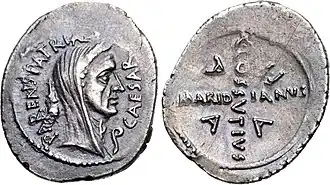 After the arrival in Rome of Julius Caesar in 49 BC, the moneyers could initially make personal types, but from 46 onwards their production was almost entirely devoted to Caesar's propaganda, with types related to Venus (Caesar's tutelar goddess), Victoria, Fortuna, or honours he received.[26] In 44 BC, Julius Caesar temporarily increased the number of moneyers to four – therefore becoming quadrumviri – for political reasons, they minted denarii with the head of Caesar, the first time a living Roman had his portrait on a coin, in the manner of an Hellenistic monarch.[27] The moneyers of the years following the assassination of Caesar mostly struck personal types again, but their production was gradually marginalised by the members of the Second Triumvirate (Octavian, Mark Antony, and Lepidus), who had their own dynastic coinage with their portraits. The last full college of moneyers minted coins in 41 BC; in 40 and 39, only one monetalis could actually issue his own coins before vanishing completely.[28]