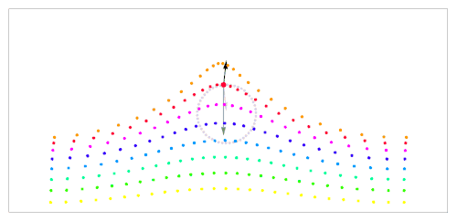 Vector contributions from the gravitational force (medium gray) and the gradient of the pressure (black) come together in an amazing way to produce the uniform circular motion of the fluid particles. For uniform circular motion, the net force (light gray) has constant magnitude and always points towards the center of the circle. The fluid particles are colored according to their values. Since the pressure is a function only of , the animation illustrates how the pressure gradient vectors are always perpendicular to the color bands, and their magnitudes are larger when the color bands are closer together.