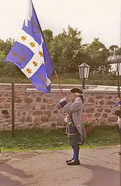 The troupes de la Marine were sent by Louis XIV in 1682 to replace the regular troops in New France, and were accordingly used to mount the garrisons in the various French colonies. Between 1683 and 1688, the King sent thirty-five companies to Canada. However, as the mortality and licensing of soldiers who were getting married and made themselves residents increased, numbers diminished considerably. Accordingly, Seignelay decided to reduce the number of companies to twenty eight on 24 May, 1689. This number would remain unchangeable until the beginning of the seven-year war. Versailles accordingly sent reinforcements by the fixing the number of companies at forty. At the end of the French regime, 2,600 soldiers of the troupes de la Marine were present in Canada. These effectifs were relatively important compared to the resident population since in 1688 for example, Canada housed 1,418 soldiers for a population of almost 10,300.[25] In a first phase, the officers present in Canada, all hailed from France. However, since 1685, the Canadian « gentilshommes » secured positions in the troupes de marine. The first two, La Durantaye and Bécancourt, embarked for Rochefort where they received a guard formation in la marine. Quite quickly, the officer corps of the troupes de la marine becomes Canadian « canadianise ». At the beginning of the 18th century, almost a third of the officers were born in Canada, then more than half of the officer corps in 1722. The officers were practically all recruited locally.[26]
