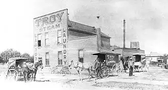 The Troy Laundry exemplified late 19th century Western false front architecture, featuring one and two-story wood frame construction spanning an area of 11,000 square feet (1,000 m2). Additions were made in 1922-23, including the replacement of the boiler. The exterior had horizontal wood siding with a gabled roof covered in wood shingles. Windows were double hung with one fixed window in the clerestory to provide light. The false front rose in steps to obscure the gabled roofline and accommodate signage. A one-story section extended to the rear, accommodating the boiler and other facilities.[1]