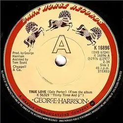 "True Love" is a popular song written by American songwriter Cole Porter, published in 1956. The song was introduced by Bing Crosby and Grace Kelly in the musical film High Society.[2] "True Love" was nominated for the Academy Award for Best Original Song. Kelly's contribution on the record is relatively minor, duetting with Crosby on only the final chorus. Nonetheless, the single is co-credited to her.