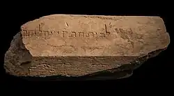 The Trumpeting Place inscription is an inscribed stone from the 1st century CE discovered in 1968 by Benjamin Mazar in his early excavations of the southern wall of the Temple Mount. The stone, showing just two complete words written in the Square Hebrew alphabet,[2][3] was carved above a wide depression cut into the inner face of the stone.[4] The first word is translated as "to the place" and the second word "of trumpeting" or "of blasting" or "of blowing", giving the phrase "To the Trumpeting Place". The subsequent words of the inscription are cut off. The third word (...לה), which is incomplete, has been interpreted as either "declare" or "distinguish", giving either: "to d[eclare (the Sabbath)]" or "to d[istinguish (between the sacred and the profane)]", where the words in square brackets represent scholarly conjecture.[2][4][5]