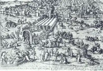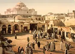 Various sources estimate the 19th-century population to have ranged from 90,000 to 110,000 inhabitants.[27] During the later 19th century, Tunis became increasingly populated by Europeans, particularly the French, and immigration dramatically increased the size of the city. This resulted in the first demolition of the old city walls, from 1860, to accommodate growth in the suburbs. The city spilled outside the area of the earlier town and the banks of the lake, and the new districts were modernized with running water (1860), lighting gas (1872), roads, waste collection (1873), and communication with adjacent suburbs and the city center.[28] The crafts and traditional trades declined somewhat, as the newcomers increased trade with Europe, introducing the first modern industries and new forms of urban life.