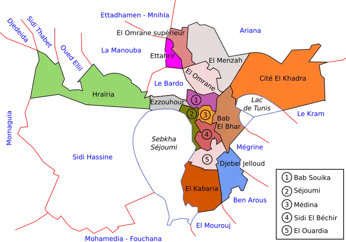 Delegation(s)El Bab Bhar, Bab Souika, Cité El Khadra, Djebel Jelloud, El Kabaria, El Menzah, El Omrane, El Omrane Superieur, El Ouardia, Ettahrir, Ezzouhour, Hraïria, Medina, Séjoumi, Sidi El Bechir