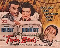 Twin Beds is a 1942 American comedy film directed by Tim Whelan, and starring by George Brent and Joan Bennett. It was distributed by United Artists. The screenplay was written by Kenneth Earl, Curtis Kenyon and Eddie Moran, based on the play of the same name by Salisbury Field and Margaret Mayo.