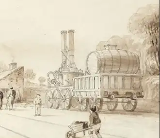 The Forman locomotive was designed, like the Twin Sisters, with two vertical boilers, although it was then built with a single-flue horizontal boiler. An initial drawing of July 1828 showed a horizontal boiler, but by the time it was ordered in December, a drawing shows it with the twin boilers. The wheels were 3 feet diameter and the cylinders of 7×20 inches, smaller than those of Twin Sisters, but the layout was otherwise similar with six wheels and inclined cylinders.[25]