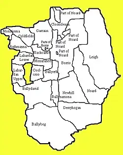 Townlands of Twomileborris civil parish. Notice the enclave of Rathcunikeen (which belongs to Ballymoreen) in the west of the parish between Lahardan Upper and Coolcroo