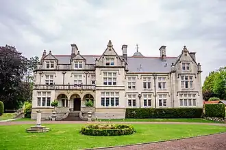 Ty Gwyn House was built by James Ephraim Turner as his personal residence in 1906 in the Jacobethan style. Turner was the senior partner of the Cardiff building firm E. Turner and Sons,[5] whose company built much of the Cathays Park civic centre of Cardiff. The house is constructed of Portland stone; with interior furnishings of Wainscot panelling made from Austrian oak. A one-storey extension to the rear of the main house has Gothic detailing and dates from 1932. It is Grade II-listed.[6] The house was illustrated in the 1929 pamphlet Superb Buildings which depicted E. Turner and Sons' projects in Cardiff.[7] The mansion house has been listed Grade II since September 2002.[6][8] Its gardens are designated Grade II* on the Cadw/ICOMOS Register of Parks and Gardens of Special Historic Interest in Wales.[9]