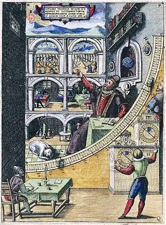 The basement of Uraniborg included an alchemical laboratory, with 16 furnaces for conducting distillations and other chemical experiments.[36] Unusually for the time, Tycho established Uraniborg as a research centre, where almost 100 students and artisans worked from 1576 to 1597.[37] Uraniborg contained a printing press and a paper mill, both among the first in Scandinavia, enabling Tycho to publish his own manuscripts, on locally made paper with his own watermark. He created a system of ponds and canals to run the wheels of the paper mill.[38] Another resident of Uraniborg was a man with dwarfism named Jeppe, whom Tycho believed had the ability to predict the future, and he allegedly was able to correctly predict the chances of recovery or death of ill people in Hven.[39]