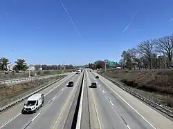 US 30 gains a center left-turn lane before it leaves Irwin and becomes a four-lane divided highway as it comes to the Irwin interchange with the Pennsylvania Turnpike (I-76). Past this interchange, the median turns into a center left-turn lane.[2][3]