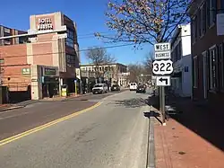 When the Sproul Road Bill was passed in 1911, the road leading south from West Chester was designated as part of Legislative Route 135, which continued to the Delaware border, while the road heading northwest from West Chester to Downingtown became Legislative Route 137, which continued to Lebanon.[4] South High Street was designated as part of US 122 in 1926. In 1927, Hannum Avenue and Gay Street became a part of PA 5.[5][6] PA 29 was designated concurrent with US 122 on South High Street in 1928; in addition, PA 52 and PA 62 followed the street from downtown south to Price Street.[7] By 1930, PA 29 and PA 52 were removed from High Street.[8] During the 1930s, several route designation changes occurred in West Chester. US 122 was replaced by US 202, PA 62 was replaced by PA 100, and US 322 was designated through West Chester along Hannum Avenue, Gay Street, and High Street. US 322 replaced PA 5 on Hannum Avenue and Gay Street and ran concurrent with US 202 on High Street south of downtown, as well as with PA 100 on High Street between downtown and Price Street.[9] In 1957, US 322 was routed onto a limited-access bypass of West Chester to the north and east. As a result, US 322 Bus. replaced the US 322 designation through West Chester.[10][11] By 1970, US 202 was routed to bypass West Chester along with US 322, removing the concurrency with US 322 Bus. on High Street.[12] By the 1970s, US 322 Bus. was shifted to a one-way pair along Chestnut and Market streets.[13] In 2003, the concurrent PA 100 designation along High Street was removed.[14]