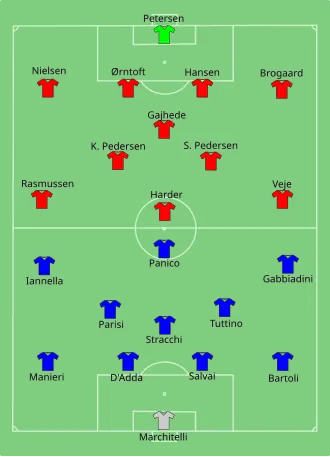 6. ^ a b "Tactical Line-up – Italy-Denmark" (PDF). UEFA. Union of European Football Associations. 13 July 2013. Archived from the original (PDF) on September 24, 2013. Retrieved 13 July 2013.