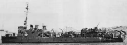 USS Chandler (DMS-9) fully converted to a minesweeper, May 1945. Note three funnels, and squared off stern holding sweep gear. Two davits or cranes used for hauling sweep gear are at her stern.