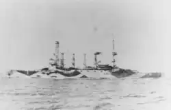 The keel for Montana was laid down at the Newport News Drydock & Shipbuilding Co. in Newport News on 29 April 1905. Her completed hull was launched on 15 December 1906, and after fitting-out work was completed, the new cruiser was commissioned into the United States Navy on 21 July 1908. She was assigned to the Atlantic Fleet and was transferred to Norfolk, Virginia. Montana steamed out of Norfolk on 5 August for a cruise off the eastern coast of the United States that lasted until 25 January 1909.[4] On 8 October 1908 she put on a searchlight display as part of a fireworks display at Philadelphia. During the display her searchlights blinded the operator of Philadelphia Police Department steamer Visitor that then had a slight collision with a barge that "Visitor" was going to, to help put out a fire on board caused by malfunctioning fireworks.[5] After a stop in Charleston, South Carolina, she continued south through the Caribbean Sea, arriving at Colón, Panama on 29 January. There, she joined the Special Service Squadron. This duty was interrupted twice;[4] the first came in February, when she returned to Hampton Roads, Virginia, where she and the rest of the Atlantic Fleet greeted the Great White Fleet at the conclusion of its circumnavigation of the globe.[6] The second came in April, owing to instability in the Ottoman Empire following the Young Turk Revolution that threatened American interests. Montana departed Guantanamo Bay, Cuba, on 2 April, when she was sent to the Mediterranean to protect Americans in the region. She remained there until 23 July, when she left Gibraltar, arriving in Boston on 3 August. She thereafter returned to her normal operations patrolling the eastern coast of the United States.[4]