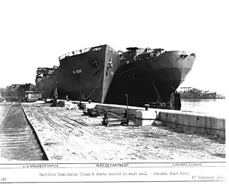 USS Pembina (AK-200) and other AKs moored at the west wall, Brandon Pool, Chicago, Illinois, 27 February 1945, waiting transit to New Orleans for fitting out and commissioning.