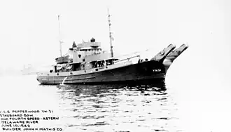 Pepperwood (YN–31) was laid down 25 October 1940 by John H. Mathis & Company, Camden, New Jersey; placed in service at Camden 8 June 1942; sponsored by Mrs. It. E. McShane; and commissioned at Norfolk, Virginia, 15 December 1942. Pepperwood reported for duty to Commander, U.S. Atlantic Fleet. She departed Norfolk 28 December 1942 for Morehead City, North Carolina, her station from 1 January to 28 February 1943, when reassigned to Norfolk.