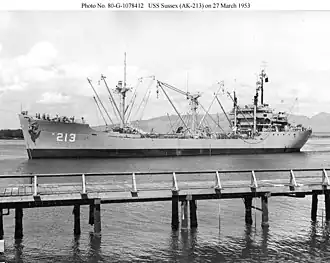USS Sussex (AK-213) was an Alamosa-class cargo ship that was constructed for the US Navy during the closing period of World War II. She was retained by the Navy for post-war service, including that in the Korean War theatre where she earned three battle stars and then returned home for deactivation.