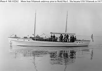 Tillamook was built as a civilian motorboat or motor yacht of the same name in 1911 by the Matthews Boat Company at Port Clinton, Ohio. The U.S. Navy purchased her from her owner, Mr. D. C. Whitney of Detroit, Michigan, on 14 May 1917 for World War I service as a patrol vessel. She was commissioned on 1 June 1917 as USS Tillamook (SP-269), although some sources claim that she was commissioned as USS SP-269 rather than under her civilian name.[3]