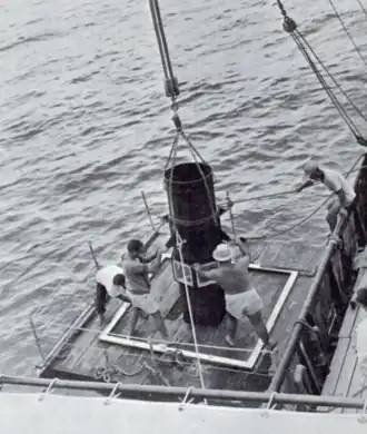 Charles H. Gilbert made her 34th cruise – another skipjack-scouting trip in Hawaiian waters – between 21 June and 21 August 1957[76] and made a major discovery: A “skipjack hole”[77] or “skipjack concourse”[78] – a place where skipjack occur year-round rather than only seasonally[78] – off Cape Kaea, Lanai.[76] Her discovery prompted POFI to begin an intensive study of the "skipjack concourse" in July 1957.[78] She collected physical, chemical, and biological data about the "concourse," finding a temperature discontinuity of 1 to 1.5 degrees Fahrenheit (0.56 to 0.83 °C) over about 0.25 nautical miles (0.46 km; 0.29 mi) in the area and more plankton in the discontinuity than on either side of it.[76] She tagged and released 2,416 skipjack – 1,624 of them between 3 and 13 July alone while fishing in the "skipjack concourse"[77] – in the hope that their movements would shed light on the still-mysterious migration of skipjack into Hawaiian waters each summer,[77] and 212 of the fish she tagged were caught by commercial fishing boats by November 1957.[76] She also experimented with a POFI-designed steel and plastic observation "bucket," a subsurface observation platform which she could suspend about 8 feet (2.4 m) below her hull near her stern, allowing a scuba-equipped scientist to observe directly the underwater behaviors of fish in her vicinity for the first time.[79][80] Reporting visibility as great as 180 feet (55 m), scientists in the "bucket" observed the behaviors of bait fish — nehu (Encrasicholina purpurea), Hawaiian silverside (Atherinomorus insularum), and Mozambique tilapia – around the vessel both when she was fishing and when she was not, and at one point estimated 1,000 skipjack and little tunnies around the vessel.[76] Her experiments determined that a scientist could sit in safety in the "bucket" while the vessel made up to 6 knots (11 km/h; 6.9 mph).[79] POFI hoped that this new technique would allow scientists to use their time more efficiently by directly observing the behavior of tuna with regard to bait and artificial lures rather than inferring their behavior indirectly through the use of statistics.[78] She also operated her Sea Scanar against a school of yellowfin, a number of skipjack schools, and several herds of porpoises, sometimes maintaining contact for several hours, but also learning of the device's operational limitations.[76] She occupied an International Geophysical Year oceanographic station at 21°10′18″N 158°18′48″W / 21.17167°N 158.31333°W / 21.17167; -158.31333 on 21 June, 21 July, and 20 August,[76] and carried out a monthly 20-station environmental survey off Oahu in June, July, and August, where she made plankton hauls and bathythermograph casts and collected seawater samples for later analysis of their salinity and inorganic phosphate content.[76] She also made weather reports four times daily, noted sightings of fish, and broadcast information on fish sightings to commercial fishing boats.[76]