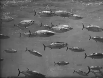 Charles H. Gilbert left Kewalo Basin on 8 or 9 October 1958 (source gives both dates) to begin her 42nd cruise, intending to make further observations of skipjack feeding behavior in Hawaiian waters.[93] She spent the first half of her cruise in Hawaiian waters, but skipjack were so scarce that she could accomplish nothing, so she moved south to the Line Islands.[93] As POFI scientists expected, she found skipjack there,[93] sighting 39 confirmed schools of skipjack or yellowfin.[94] Scientists used her submersible platform to observe the reaction of skipjack and yellowfin to lamp black dye, chumming with tilapia and mullet, and water sprays.[94] For the first time, scientists were able to observe directly the behavior of yellowfin and compare it to that of skipjack, and they discovered that yellowfin behaved much like skipjack except that they tended to swim below the skipjack at a depth of about 10 feet (3 m) and dash upward to feed on tilapia or mullet chum.[94] She also spent one day each fishing for bait at Fanning Island and Palmyra Island, finding mostly mullet in the 3-to-8-inch (7.6 to 20 cm) range.[94] She returned to Kewalo Basin on 17 November 1958.[93] The turbulence created by the submersible observation platform greatly interfered with its ability to support effective underwater photography and film-making, and it was removed from Charles H. Gilbert after her return to port.[95] The USFWS began to consider alternatives – such as installing underwater television and a porthole in the vessel's hull below the waterline — and their relative costs.[95]