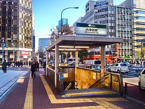 Uchisaiwaicho Station is served by the Toei Mita Line, and lies 6.4 km from the starting point of the line at Meguro.[1] It is numbered "I-07". It is also relatively close to Shimbashi Station on the Tokyo Metro Ginza Line and Toei Asakusa Line (located 230 meters to the southeast), although it is not officially recognized as a transfer station and there is no transfer corridor between the two stations.