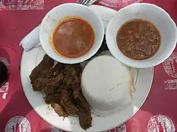 Posho or ugali consists of maize flour (cornmeal) cooked with water to a porridge- or dough-like consistency. Pictured on the bottom right of the plate, it is served with beef and sauce.