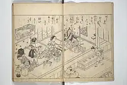 Yoshida Hambei was the main illustrator of Ihara Saikaku's books and was a renowned ukiyo-e artist. It is estimated that he was active between the 1660s and 1690s, during that time he produced over half of the illustrations for Saikaku's works as well as many other ukiyo-zōshi novels. He was popular in the older districts of Kyoto and Osaka and his style and art rivaled that of the renowned Moronobu School in Edo.[28] His art reinforced descriptive details elegantly in their matching texts as well as depicted narrative progression in the plot.[29]
