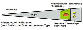 The unchambered long barrow[1][2][3] earthen long barrow,[1][3] non-megalithic long barrow[2][3] or non-megalithic mound[4] (German: kammerloses Hünenbett or Hünenbett ohne Kammer), is a type of long barrow found across the British Isles, in a belt of land in Brittany, and in northern Europe as far east as the River Vistula (the Niedźwiedź type graves - NTT). The term "unchambered" means that there is no stone chamber within the stone enclosure. In Great Britain they are often known as non-megalithic long barrows or unchambered long cairns.