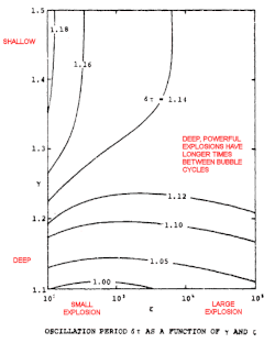 Bubble oscillation period as a function of water pressure and blast size