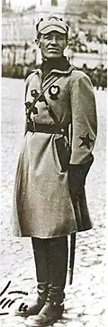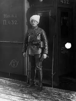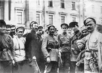 In the early period of the civil war, when troops often had to supply or produce their own uniforms, the cultural obsession with the colour red manifested once more. Soldiers sought out red materials to make their tunics and according to G.H. Mikhailovsk, a Russian diplomat, an entire unit outfitted in the colour occupied Sevastopol in 1919: 'Over all the city... [from] Nakhimovsk Avenue to Ekaterininsk Street [there] was ... a red cavalcade all in red garments from head to toe, with high white gaiters on some... so that they looked like a new type of American red Indian'.[25][26] Even experienced commanders would wear women's coats with some sense of pride if they sported a suitably proletarian hue.[25]