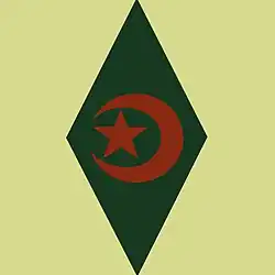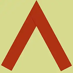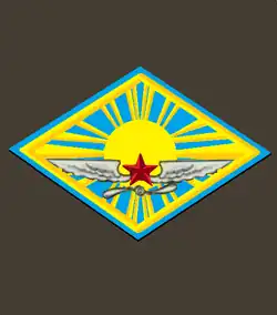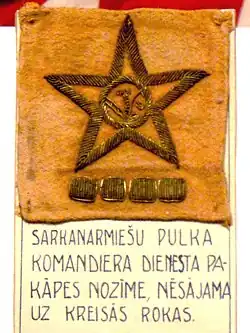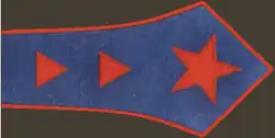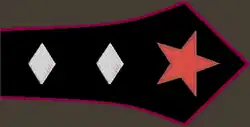 As the army became more conventionally hierarchical, the lack of any kind of distinctive rank insignia beyond the universal, and vague, red sleeve star became a greater issue. This was attested to by commanders such as I.P. Uborevich of the 18th Rifle Division who went to the lengths of creating a system of symbols for his own unit not long before the introduction of the official rank markings.[71] This official insignia took the form of a red cloth star (11 cm in diameter) with a black border (printed with ink) near the inner edge and a black hammer and sickle (also ink) above the left cuff (centred 12.5 cm above the cuff): under this star would be one to four triangles (4 cm a side), squares (3 cm a side), or diamonds (3.5 cm height and 3 cm width) organised in a horizontal line also of red cloth with the black inner edge stitching. The senior ranks, which used diamonds, had a larger star (14.5 cm in diameter) which had an additional black inner edging within the first: the diamonds also had this additional edging.[65] Various local and unofficial variants of these insignia also existed, with some of these combining both rank and branch distinctions.[60][70] Often commanders would also organize the shapes into varying patterns until uniformity could be properly enforced.[20]