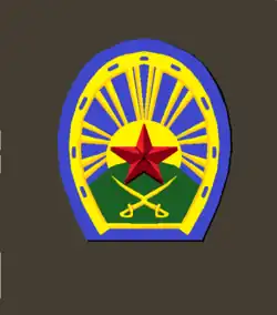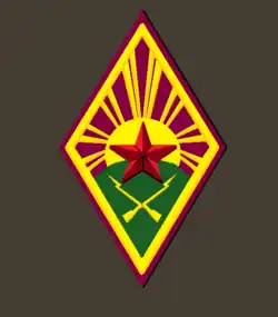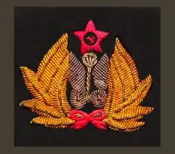 During the Red Army's brief flirtation with military democracy, insignia was essentially along the same lines as that of the Red Guards; the only further development beyond this at that time was a cloth red star above the left cuff indicating a commander of a force of any size. After its return to form, the army began to slowly introduce its own distinct insignia.[49] The first of these, introduced by the Supreme Military Soviet (SMS)[f] on 29 July, was 'the Revolutionary Military Symbol of the Red Army': a red enamel or painted star containing a bronze hammer-and-plough device set within a silver wreath (an oak branch on the left side and a laurel on the right). This was essentially the Red Army's membership badge which was worn on the left breast. It was initially worn by only commanders and cadets but soon could be worn by all Red Army servicemen (if this or the sleeve star was not worn the quality of a man's uniform could imply his status as a commander).[51][52][17] Under these badges or in the bottom gap between the laurel and the star, shoulder board branch badges from the old army would sometimes be worn.[53]