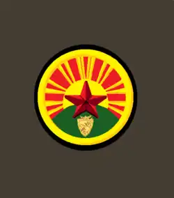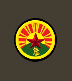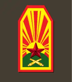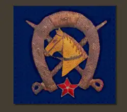 On the same day a dedicated cap badge of a slightly convex enamel or painted star with hammer-and-plough was also introduced.[55] This was intended to be worn on the band but would often be worn on the crown instead.[56] In 1918 the star was actually worn "upside down" (two points up and one down) but would be changed to the expected orientation by the end of the year.[52] In lieu of official red stars, one of the unofficial locally made variants, or Red Guard style cloth insignia, soldiers would sometimes wear the golden stars from old tsarist officers' shoulder boards and in other cases tsarist branch of service shoulder badges on their caps (an example would be the crossed cannons of the artillery).[7][56][57]