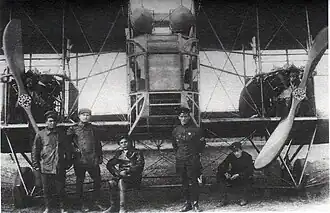 Commanders in the field typically wore a brown leather braceless belt with one or two separate straps crossed across the chest, typically a sabre on the left strap and a pistol on the right, whilst others would wear belts with either two vertical shoulder braces (this being the Tsarist M1911 and M1912) or a single diagonal one over one shoulder.[41][32][43] After November 1917 wearing two front braces vertically was banned, presumably to help differentiate between friend and foe, but this was not universally followed.[44] Upon these belts were worn map cases, pistol holsters (although simply tucking pistols into belts was common practice until 1922), kindzhal daggers, binocular cases, and whistles on the brace; the Mauser C96, with its wooden holster-stock combination, was the sidearm favoured most.[41][45][46] Sabres and shashkas were worn in the 'oriental' manner, this being on a separate over-the-shoulder strap with the cutting edge facing backwards.[36] Leather equipment of Caucasian chic, black with chased silver ornaments, was especially fashionable amongst those on the southern fronts.[47]